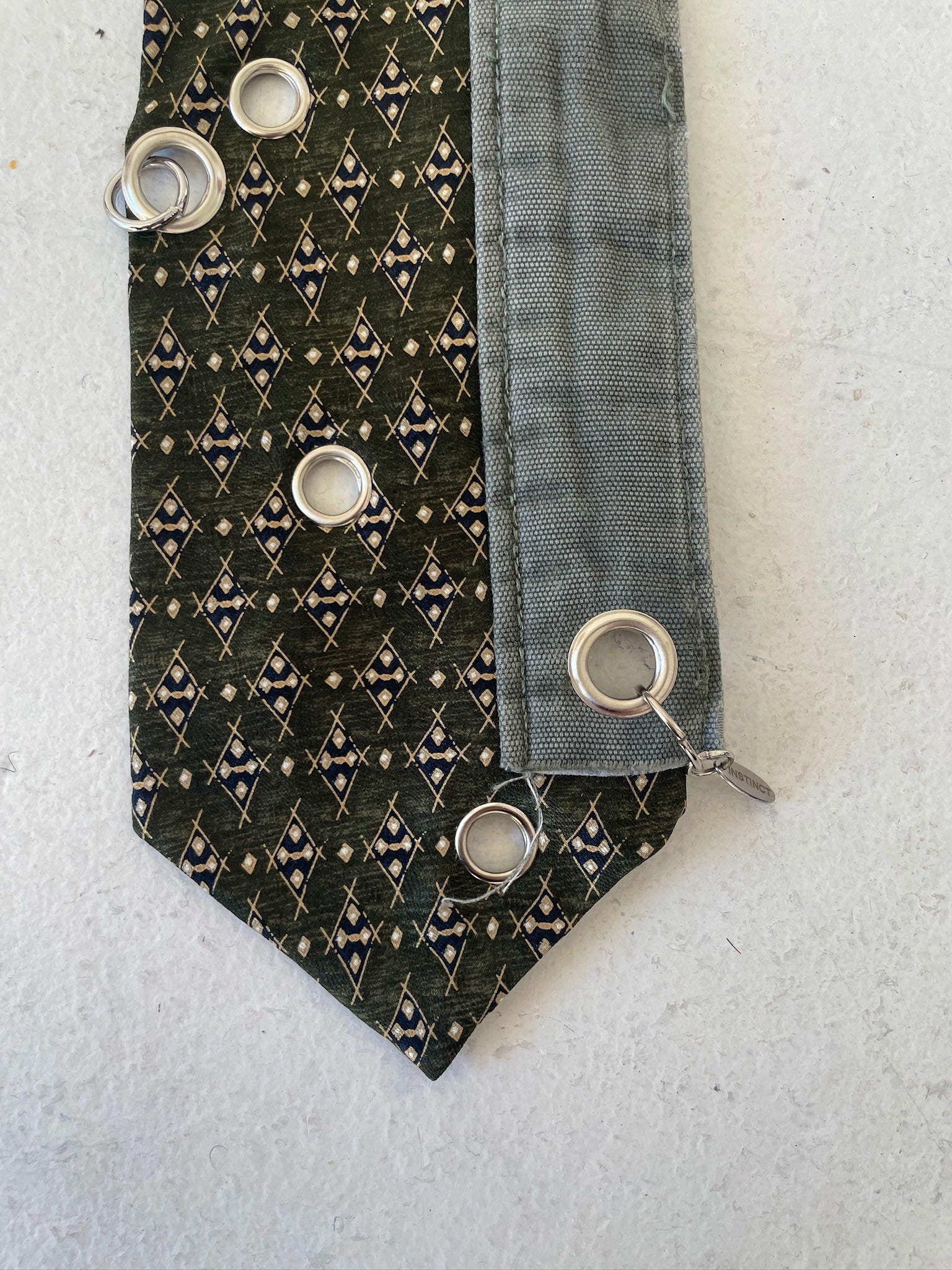 100% silk green suiting tie upcycled with silver eyelet hardware and fabric scraps. Please note that this tie is vintage and may have some slight signs of wear.