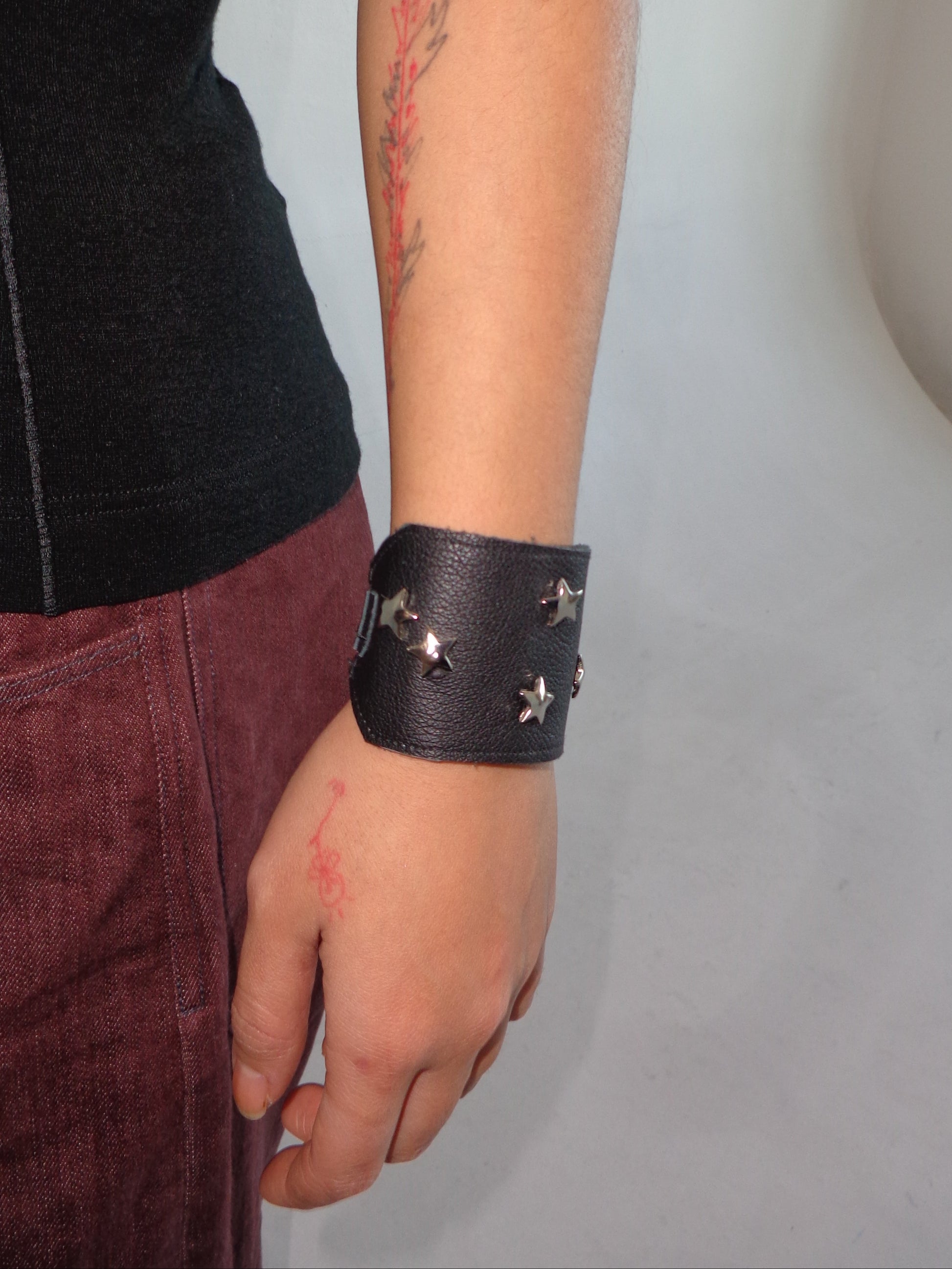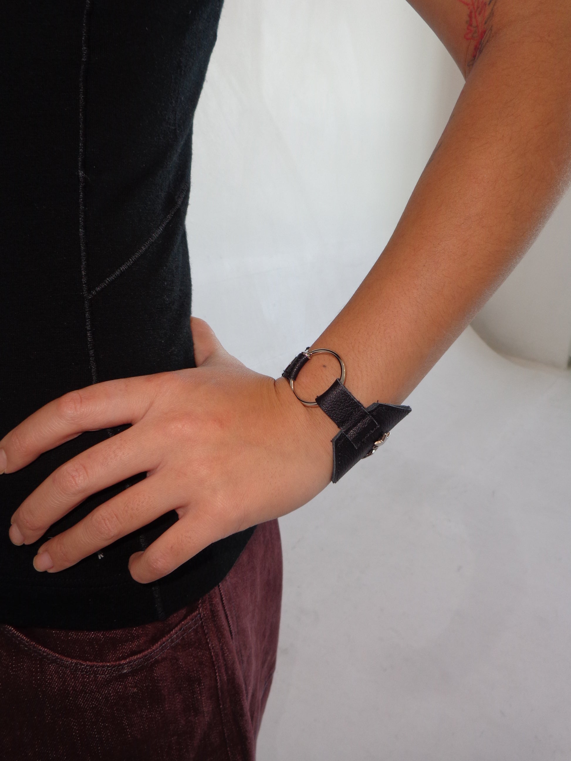 Cuff bracelet made from scrap genuine leather and silver hardware with snap closure.