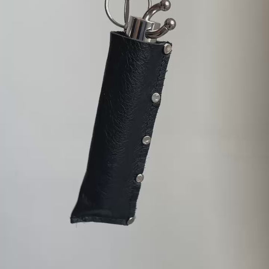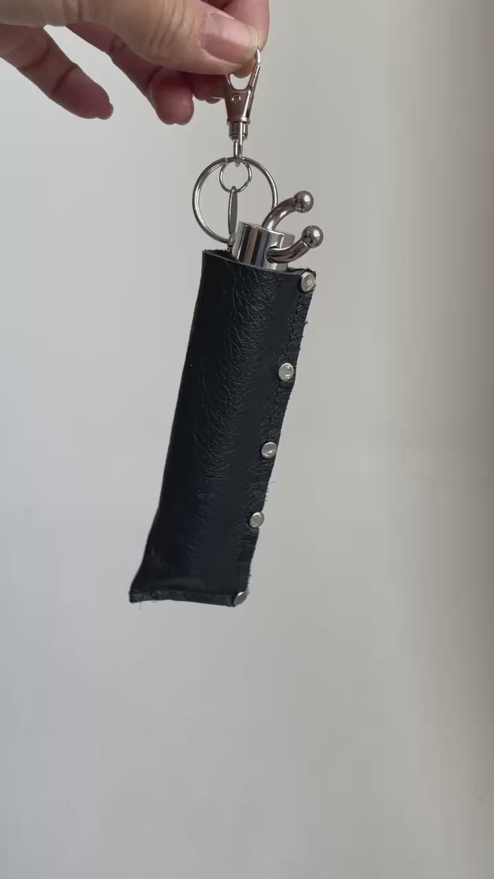 Keychain made from scrap genuine leather and silver hardware. Can hold small items such as lighters and lip glosses.