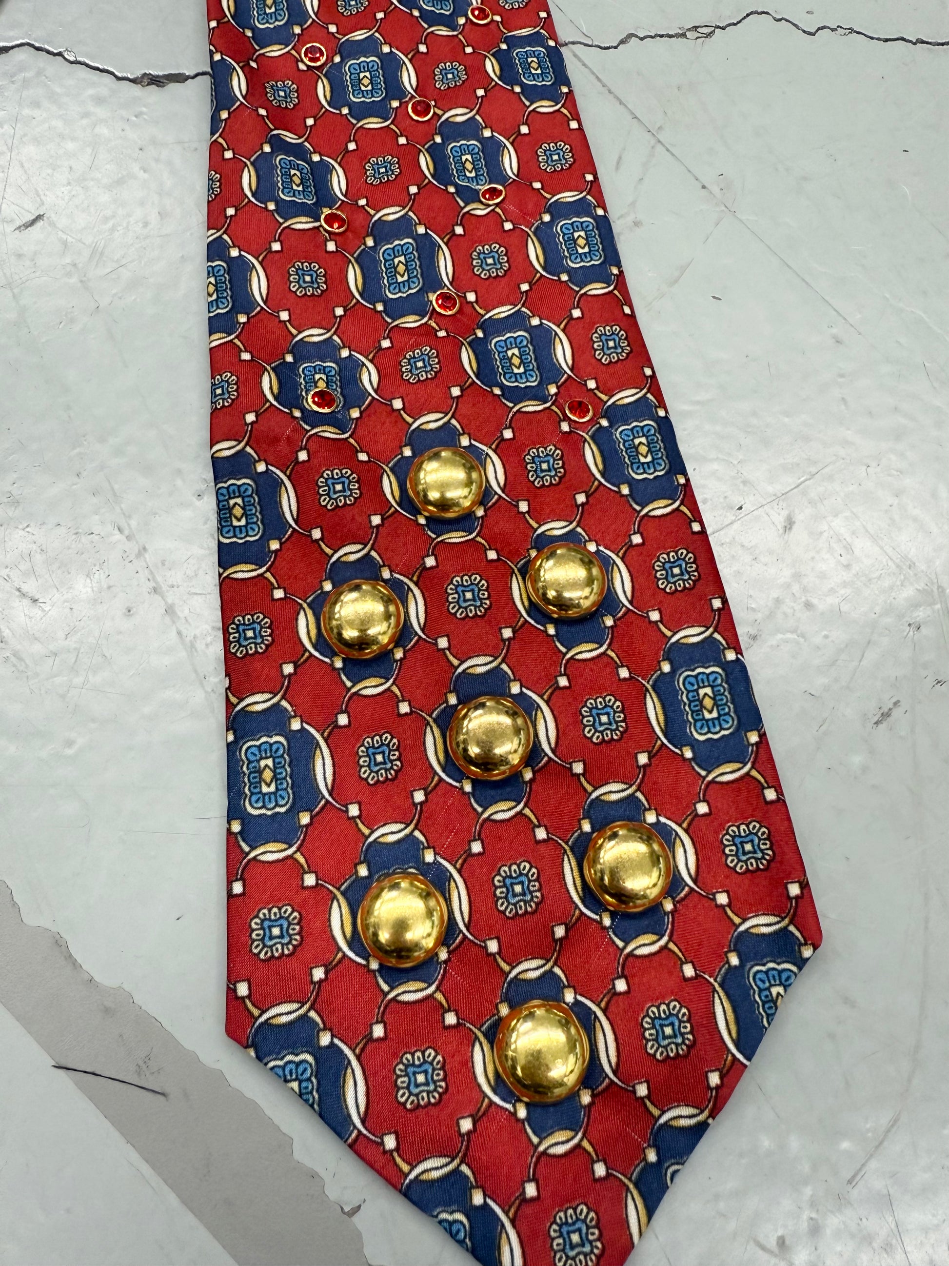 Vintage red suiting tie upcycled with gold metal and ruby stud hardware. Please note that this tie is vintage and may have some slight signs of wear.